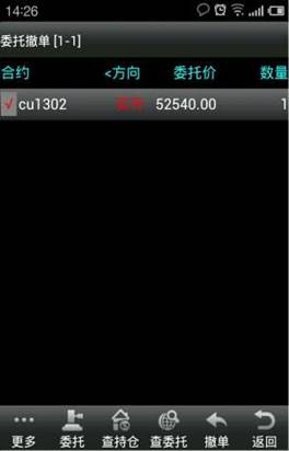 ◇ 查委托:點擊“查委托”,進入委托單界面,可以查看到委托的合約、委托價格以及數