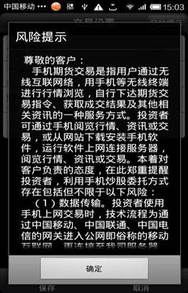 ◇ 風險提示:選擇右上角“風險提示”時,在登錄交易的時候就會出現風險提示對話框。