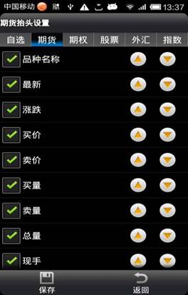 設置自選、期貨、期權、股票、外匯、指數等六大市場顯示的抬頭字段及字段的順序。