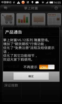 顯示通告:設置掌上財富軟件登錄后是否顯示通知消息框,默認為“顯示通告信息”,