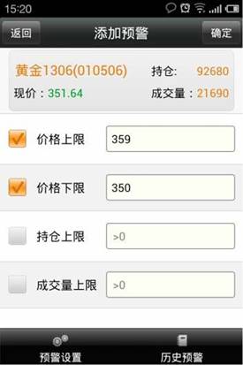 可以對價格上限,價格下限,持倉上線,成交量上限做預警設置,價格上限和價格下限